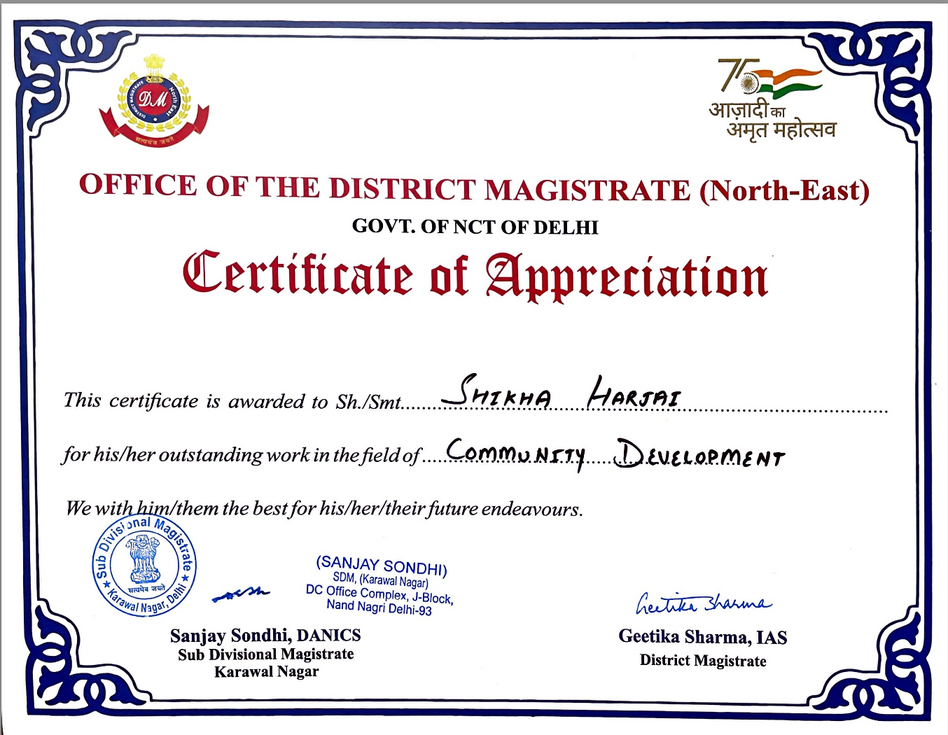 It is a great honor and privilege for our trust, which has only been worked for a short period of time, to receive an appreciation certificate from the DM office of the North East District of Delhi. This recognition is a testament to the hard work and dedication of our team, who are committed to making a positive impact in the lives of those we serve. The certificate is a validation of the efforts we have made to provide assistance and support to the community, and it is a source of inspiration for us to continue our work with even greater resolve. It is also a reminder of the trust and confidence that the DM office of the North East District has placed on us, and a sign of the positive relationship that we have built with the local government and community. We are deeply grateful for this recognition and look forward to continuing our work to make a difference in the lives of those in need.